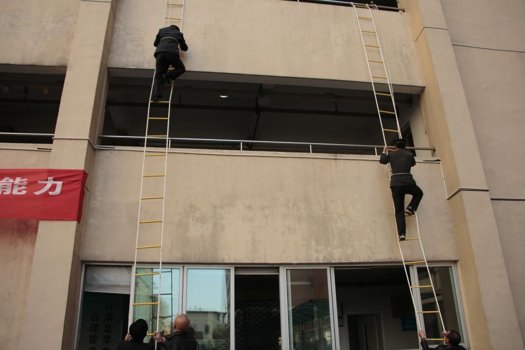 中午演练活动开始,“消防警报”信号拉响,校园“110”求助中心接到公寓管理人员报警,并说明学生公寓D幢2楼走道发生了“火情”和起火原因、起火规模等。随后学院立即启动应急预案。在领导小组的统一指挥下,保卫处,学工部、义务消防队、疏散组、医疗后勤保障组等立即进行救火、疏散、救护等措施。在烟雾中,参演学生们在老师的引导下,用湿毛巾或衣服捂住口鼻,依次猫着腰、沿着消防通道迅速撤离。随后,在我院保卫处人员和学院老师的带领下,同学们观看了软梯逃生的体验活动。整个演练过程井然有序,顺利完成。