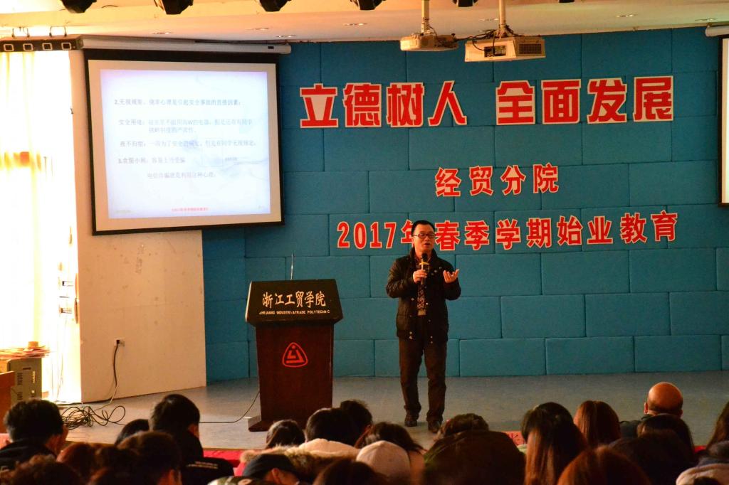 2月19日,经贸分院以“立德树人 全面发展”为主题的2017年春季学期始业教育在阶梯教室举行,经贸分院党总支书记张勰、院长汪焰出席会议并讲话。