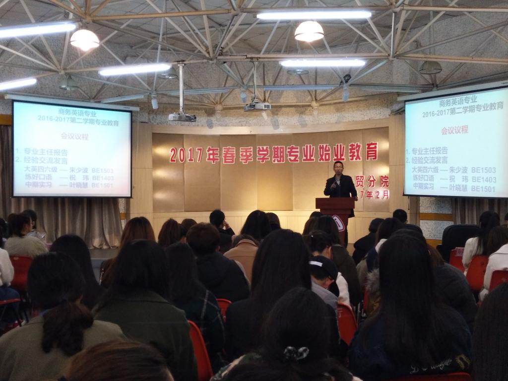 商务英语专业主任徐国盛老师进行了“夯实专业基础 促进优良学风建设”的专业始业教育。他分别从新学期工作重点、实习实训、考级考证等方面对新学期的专业安排和部署进行了介绍,并对新学期同学们良好学风的养成提出建议和希望。朱少波、祝玮、叶晓慧等三位同学分别从四六级考试、口语练习、 中期实习经验等方面进行了分享和交流。