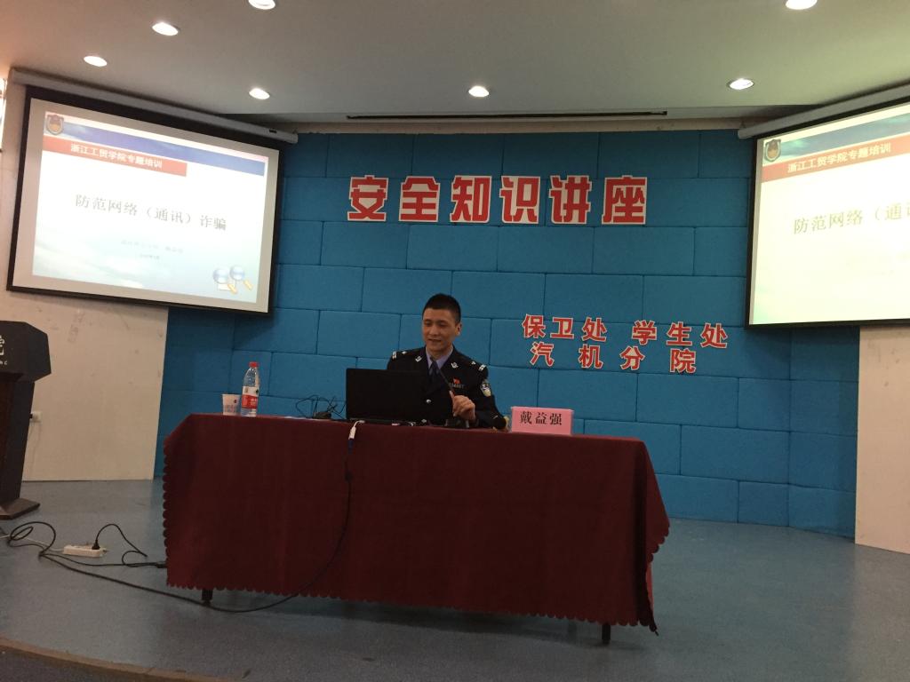 为进一步增强学生安全防范意识,提高识骗防骗能力。2017224日,学院保卫处、学生处联合信息与传媒分院、汽机学院邀请了温州市公安局基层基础支队戴益强警官为我院师生在阶梯教室举办了两场生动而富有教育意义的网络安全知识讲座。信息与传媒分院及汽机分院2016级新生共1000余人到场聆听。
