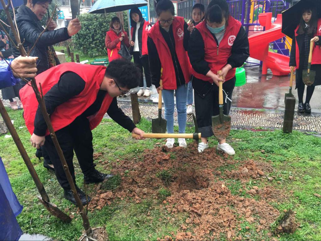 天公不作美,下着连绵不断的小雨,但这丝毫没有减弱同学们种树的热情。大家两两合作分组,一人撑伞,一人做事。挖坑、护树、埋土、压土,工作有条不紊。虽然挖坑需要很大的力气,但女生们不甘示弱,尽心尽力的挖着,更多的是享受过程,用心去完成各项任务。随后,大家还将社区准备好的“保护树木”标识挂着刚种的小树上,提醒社区居民保护绿色。
