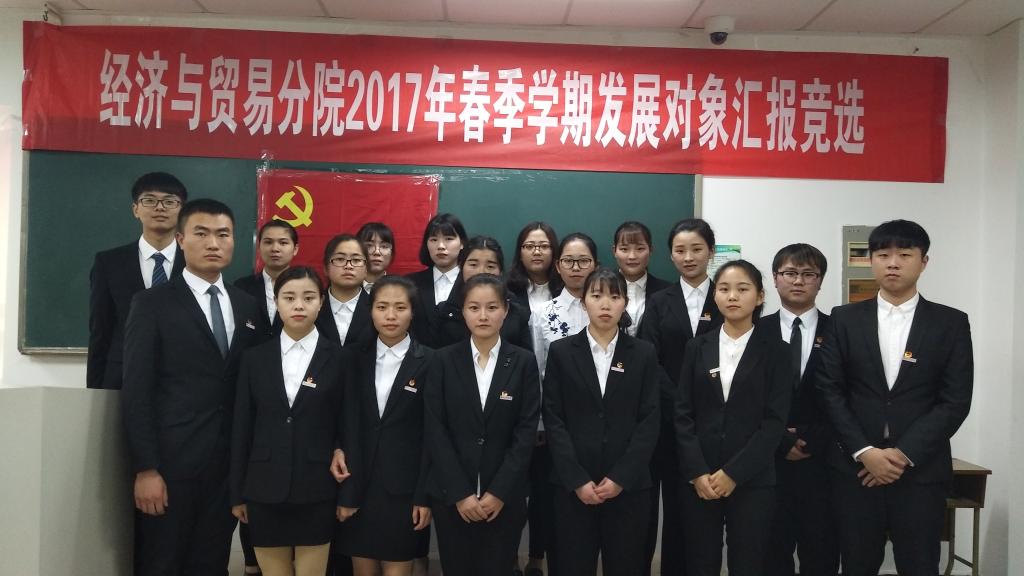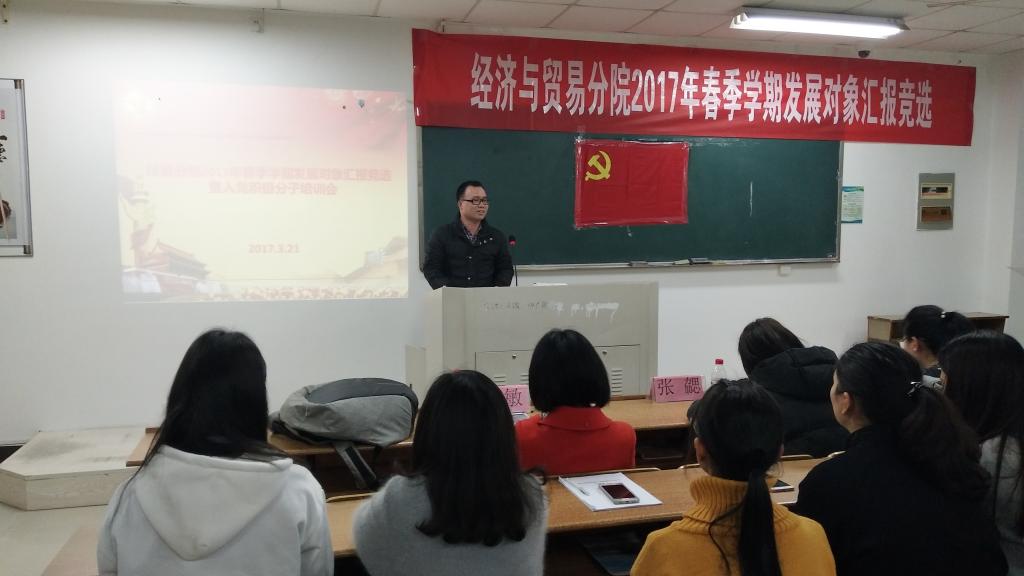 3月21日晚上,经贸分院在6号楼6304教室举行2017年春季学期发展对象汇报竞选暨入党积极分子培训会。担任此次评委的分别是经贸分院党总支书记张勰,党总支委员刘敏,团总支书记高莎和辅导员周妍妍。