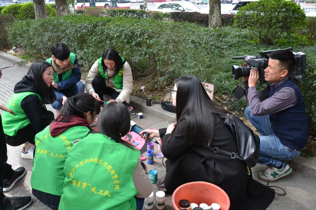 学生志愿者在社区工作人员的引导下,对辖区井盖进行“创意涂鸦”。志愿者们在选择井盖,勾勒图案、填充颜色等各个环节一丝不苟。在用颜料时,志愿者们也注意不让颜料碰到地上,等完成后再在旁边写上“颜料未干“字样,以免遭踩踏。几小时后,府前大网格辖区内数口井盖被激活,一路上的井盖画上了各种图案,变身成为一幅幅可爱的创意井盖画,引得许多路人驻足观看,低头欣赏,并拿起手机记录。更有电记者现场连线,电视台记者采访。实践部部长向记者阐述了这次活动的主要目的和意义,就是向路人传播绿色环保、爱护环境、文明友善,携手共建美好家园的精神。之后,志愿者们在公共自行车点开展对自行车辆及设备进行擦洗的志愿活动。擦洗工作虽然辛苦繁琐,但活动现场个个劲头十足,温馨而动人。清洗公共自行车,向市民传递了自觉爱护公共自行车的良好意识,美化了我们的城市环境。