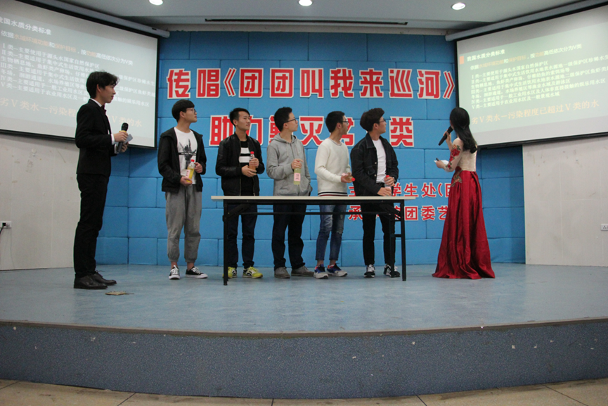 活动伊始,主持人邀请了五位观众上台玩游戏,游戏名字叫做“假如这个世界上只剩下五种水你会选择哪种”。后勤人员搬上了道具,共计五瓶水,分别从Ⅰ类水到Ⅴ类水,由台上的观众们自由选择,观众们选择好之后主持人一一讲解从Ⅰ类水到Ⅴ类水分别是哪五类水源,解析了什么是水污染,什么是垃圾河、黑河、臭河,然后引出问题:“五水共治”提出的背景是什么?治污水要抓什么?作为大学生的我们,对于灭劣Ⅴ类水能做些什么呢?“争当实践者,争当宣传者,争当监督者。”是我们大学生能做的,也是大家共同努力要去实现的。