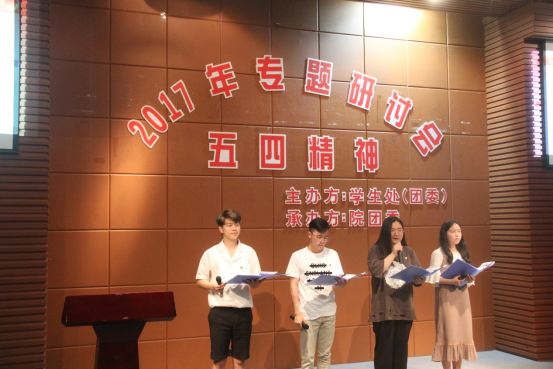 我院本次研讨会最大的亮点就是加入了全新的朗诵环节,朗诵《薪火相传五四魂》让我们用青春的方式迎接时代的召唤,以实际的行动迎接挑战。使我们懂得广大青年一定要自觉肩负起时代赋予的重任,继承和发扬“五四”光荣传统。让我们志存高远,脚踏实地,不忘初心,坚定信念,用信仰的力量驾驭前进方向,勇于创新,创业创新。