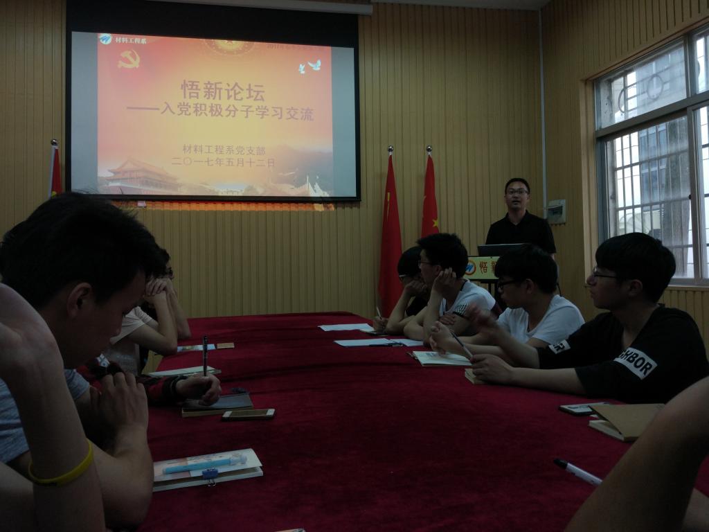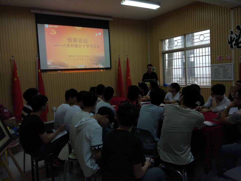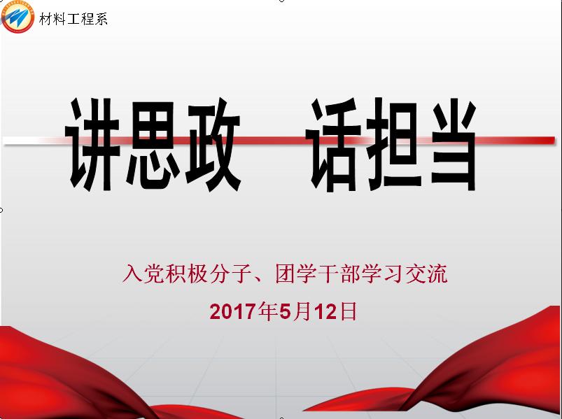 2017年5月12日,材料系党支部举行本学期第三期悟心论坛,参加对象是入党积极分子和团学干部,活动主题是“讲思政、话担当”,由党支部书记万登泸老师主讲。