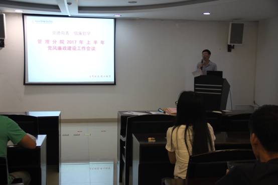 会上,项光春老师首先传达了学院2017年上半年党风廉政建设责任制分工及落实党风廉政建设责任制的有关要求,然后就2017年党风廉政建设责任书的内容从“落实党风廉政建设责任制、推进惩防体系建设、开展廉洁文化教育、深化作风建设、强化监督管理、重视信访举报和案件查办工作、及时报告有关情况、带头从严自律”等八个方面进行了说明,并要求党员干部切实履行“一岗双责”、认真落实“三重一大”决策制度,希望全体党员和广大教职工加强学习、敬业奉献、遵守纪律、为人师表,不断增强自身的廉洁从业意识和拒腐防变能力,为推进分院改革发展稳定做出贡献。