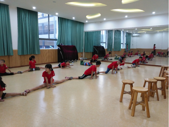 在午休过后,服务队带领小朋友们开展了舞蹈课。在偌大的镜子前,小朋友们开心又活泼地摆动着自己的肢体。从开始的集体热身——抢凳子游戏,摆臂动作,到后续的下劈接力,小朋友们纷纷秀出自己的柔韧性。一堂舞蹈课下来,汗水味充斥着衣间,但希望的星点总夹在其中。