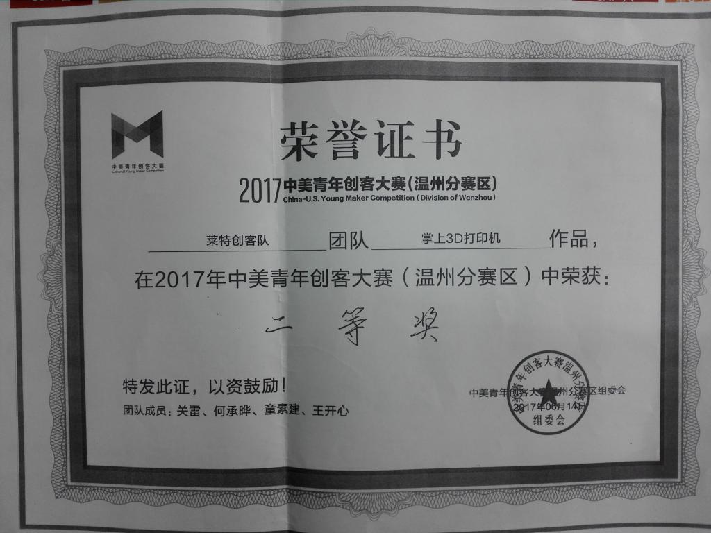 今年六月初,他们萌生了依托专业技术创业的想法,通过团队的努力,他们的项目成功入驻了学院的大学生创业园,随后在创业学院老师的帮助下,他们成功创办了“温州共响三帝电子科技有限公司”。而且自主研发了新产品——“便携式3D打印机”,这个产品也让他们获得了2017年中美青年创客大赛温州赛区的二等奖、总决赛的优胜奖。