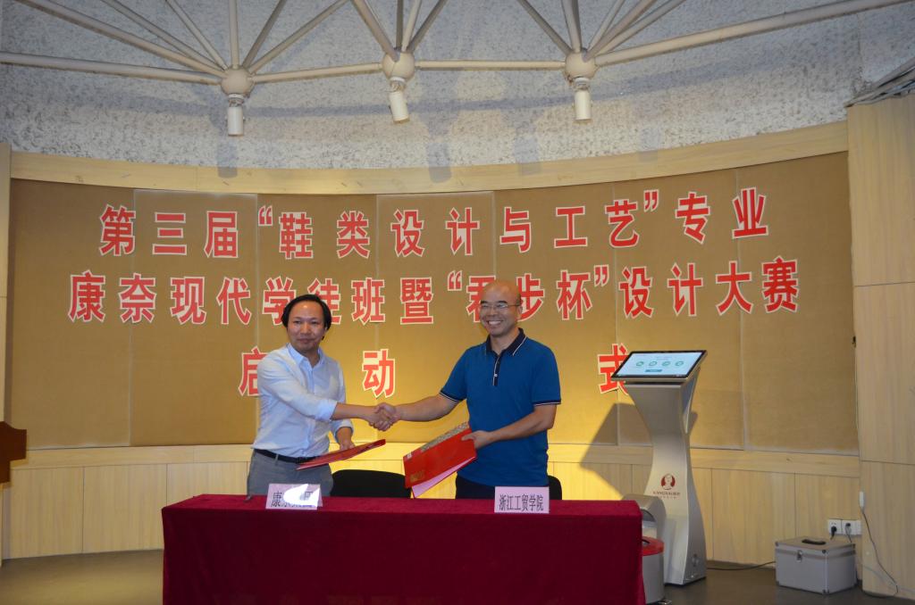 康奈集团总经理郑莱毅和副院长汪焰就浙工贸康奈脚型数据采集点的成立进行签约,这意味着校企合作的再次深入,在现场学生也亲自体会到了脚型采集仪的科技和便捷;紧接着在郑莱毅总经理和汪焰副院长分别为学生深情寄语,郑莱毅总经理希望康奈班学生在未来的学习中,能够继续享受学习的美好时光,能够学以致用,学会参与,得到全面发展,此时会议达到了高潮。伟德BETVlCTOR1946副院长汪焰首先感谢了郑总对“康奈学徒班”的重视,企业指导老师的用心良苦以及学生自己的刻苦认真都对“康奈的学徒班”有着重大的影响。同时他也希望鞋类设计与工艺专业能够以提高产业质量为目标,做出区域特色,坚持合作共赢,坚持系统设计,进一步在鞋类专业课程设计上有所突破,在现代学徒制人才培养方面进行大胆探索。