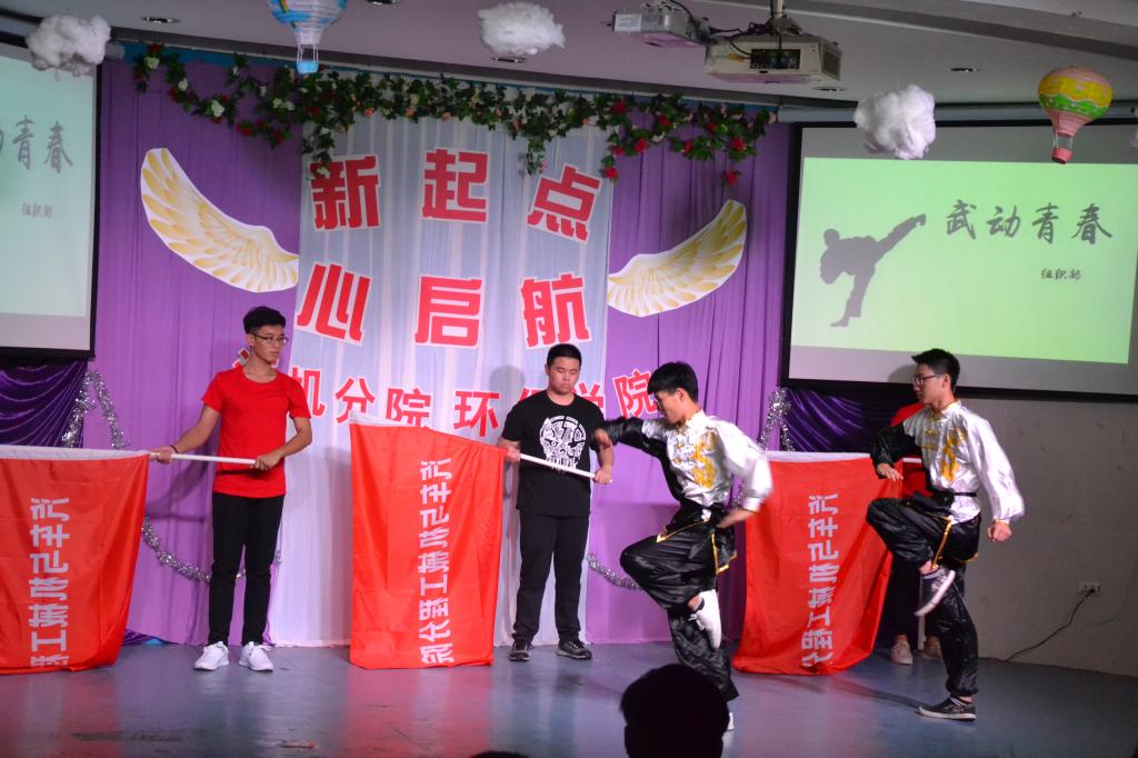 晚会主持人由大一、大二同学合作主持。开场《舞旗》虽然表演中出现小插曲,但当他们再次站上舞台时,台下的气氛还是被瞬间点燃。表演者锐气不减,每一个动作铿锵有力,展现了我们汽机男儿不服输,不怕输的品质。当然十佳歌手加盟演唱,为晚会增添一抹青春,唱出感动、唱出梦想。由学长学姐共同组成的舞蹈团队带来了一段风格怪异的中国风舞蹈,他们滑稽的舞姿使得台下笑声不断,也别有一番独特味道。个人独唱,一张酒红高椅、一把秀木吉他、一轮质朴的“安桥”声,演出了回忆,弹出了故乡,唱出了旧人,不论是视觉还是听觉,瞬间使得台下观众秒变小迷妹。此外,手语表演、诗歌朗诵等节目,也将汽机学子关怀社会、感恩生命的高尚精神风貌展现出来。整个晚会最有意思便是互动游戏“摇一摇”了吧,所有的人拿起手机在主持人发号施令后开始拼了命的挥动手机,整个会场气氛到达了高潮,节目最后向新生展示了汽机分院学生会团总支的展示,向大家展示了汽机分院的优秀,引领着新生前进的方向。