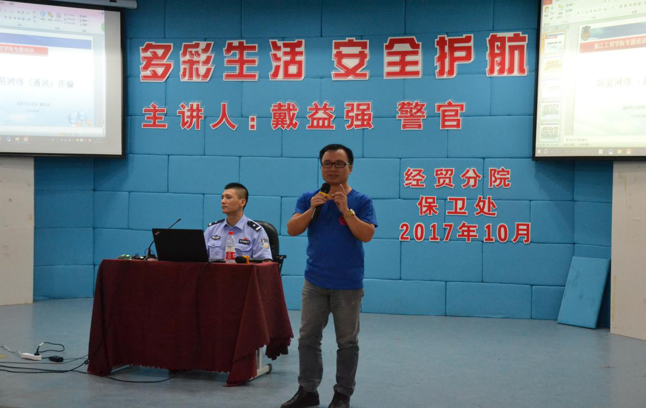 为进一步提高大一新生的安全防范意识,不断提高对各类诈骗的识别能力,2017年10月11日晚,经贸分院联合保卫处在阶梯教室为分院17级新生举办了“多彩生活·安全护航”为主题的安全知识讲座。本次讲座由温州市公安局戴益强警官主讲,主题鲜明,内容丰富,现场反响热烈,同学们深感获益良多。
