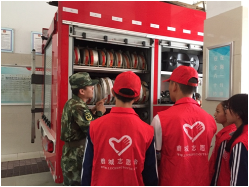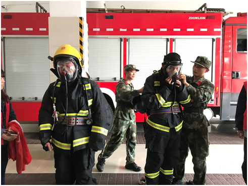 活动中,消防大队的同志带领同学们参观了消防车库,看到红色的消防车上装满了各种各样的消防工具时,志愿者们迫不及待地擦亮眼睛。消防员高官兵们耐心细致地介绍并解释了消防车上各器具的名称和用途,使同学们认识了云梯、高压喷射枪、泡沫喷射枪等工具。同时,中队同志还演习了如何快速穿上消防服,他那熟练的操作以及沉着冷静的神情,让聚集在周围的志愿者们惊叹不已,许多同学也纷纷要求试穿消防服、试戴消防衣帽呢!试穿的两名志愿者切实的体会了消防服的穿戴,穿在身上的衣物虽然十分厚重但是也切实体会了消防员们的伟大和不易!