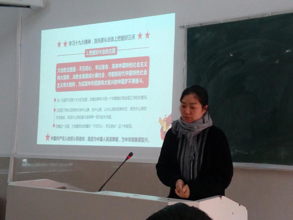 章院长首先指出了学院关于加强学习十九大精神的具体要求,并介绍了此次备课会的主要目的和重要意义。接着,思政理论教学教研室主任朱余洁老师结合市委党校组织的学习十九大精神的会议进行了交流汇报。她主要分享了关于学习十九大精神应把握好的三点内容:一是要把握好大会的主题;二是要把握好大会的重要成果;三是要把握好大会的历史精神和主要贡献。马克思主义学院院长尹清杰向与会老师介绍了参加省委学习十九大精神会议的学习情况,并重点说明了宣讲十九大精神应深刻把握主题内涵、报告成果、政治论断、社会矛盾变化、两个百年目标、党的建设总要求以及习近平新时代中国特色社会主义思想等7个方面的内容。会议最后,尹院长介绍了学院已经启动的学习十九大精神的相关活动,并就下一阶段学院开展实施的十九大精神“三进”工作进行了部署和安排。