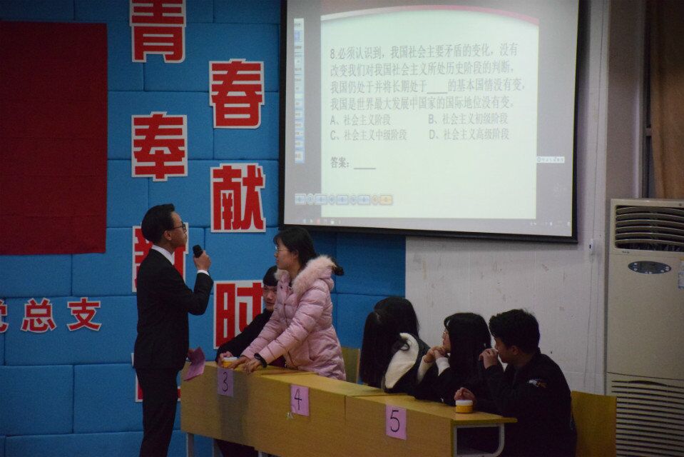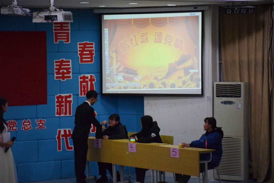 紧接着是十九大知识抢答和猜红歌环节。在知识抢答中,主持人现场邀请十名观众上台,两两分为五组,进行有关十九大知识竞赛抢答。当抢答开始时,选手们满怀信心的答案,全神贯注盯着抢答器,因为胜利就在那一刹那。第三组同学手速之快,连抢几题让人惊叹不止。让人震撼的是20题全场回答零错误,赢得场下观众阵阵掌声,同学们也密切关注着党的十九大有关内容。在猜红歌环节,五名观众自成一组上台参赛。当歌曲才响起,就有选手进行抢答。作为新时代的青年对红歌的熟悉程度满满透露出对党的敬与爱。