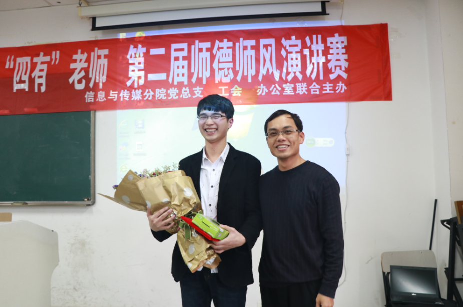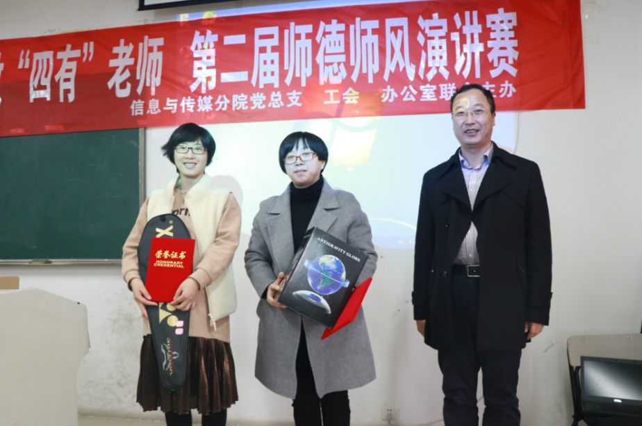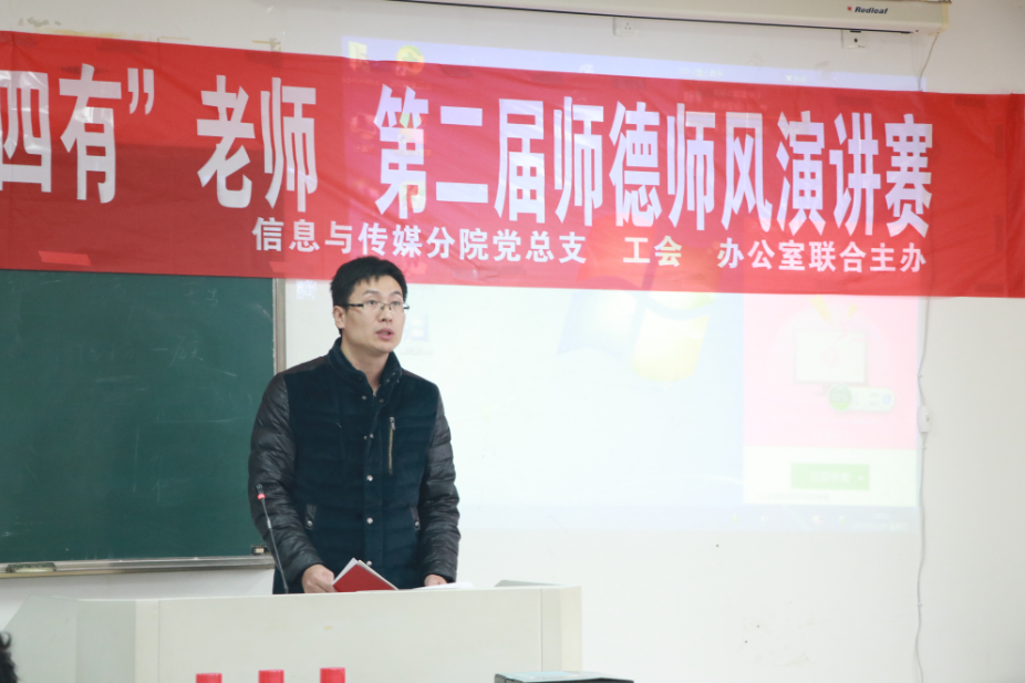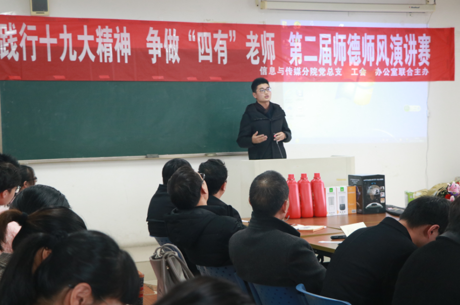 为践行十九大精神、争做新时代“四有”新老师,进一步加强师德师风建设,将立德树人工作落到具体的言行和教学之中,2017年12月29日下午,信息与传媒分院党总支、工会、办公室联合举办“践行十九大精神,争做新时代四有好老师,第二届师德师风演讲赛”。信息与传媒分院全体教师参加了本次活动,来自不同办公室及专业教师团队的九位老师作为选手参加了本次演讲比赛。