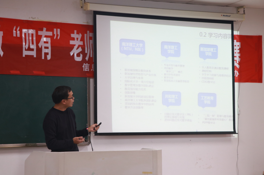 会议的第二项议程是潘修强老师做赴新加坡学习教育相关报告。报告主题是《教师角色与以学生为中心》。报告中潘老师结合新加坡学习提出了两个问题:一、为什么要进行信息化教学?二、老师的角色和功能在供给侧中发生了什么变化?对于这两个问题,潘老师结合在新加坡学习的见闻和自己的思考,现场用微信和老师交流问题。在互联网时代,老师所面对的是与以前不同的学生,在这个情况下,老师要紧跟变化,实时更新自己的储备及技术,在当下寻找自己的不足,并改进,技术、教学法和学科之间要进行整合,不能侧重单个或两个,必须三方整合。对于老师的角色和功能提供,潘老师认为,在未来,教师这个职业,在教书育人上更加要注重育人,培育学生健全的人格,发挥立德树人的功能。