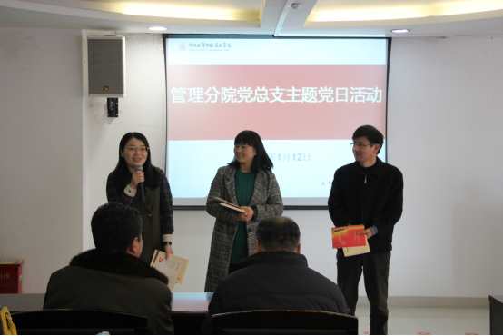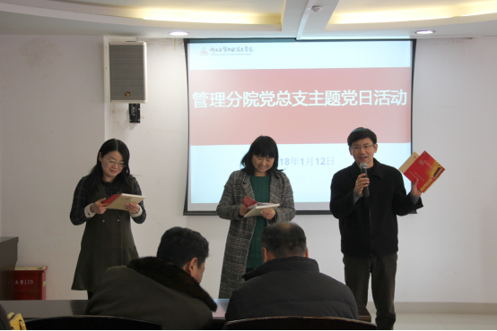根据管理分院党总支全面推行主题党日活动的实施办法,管理分院教工党支部、学生第一党支部、学生第二党支部、学生第三党支部于2018年1月12日联合开展2018年首个主题党日活动,管理分院全体教职工党员参加活动。
