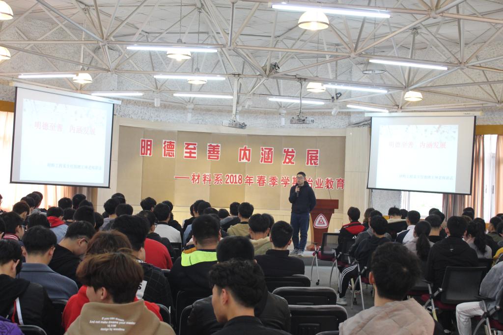 2018年3月4日下午,材料系在多功能厅举行了“明德至善内涵发展”为主题的2018年春季学期始业教育。材料系书记、辅导员、各班班主任和材料系全体学生参加本次大会。