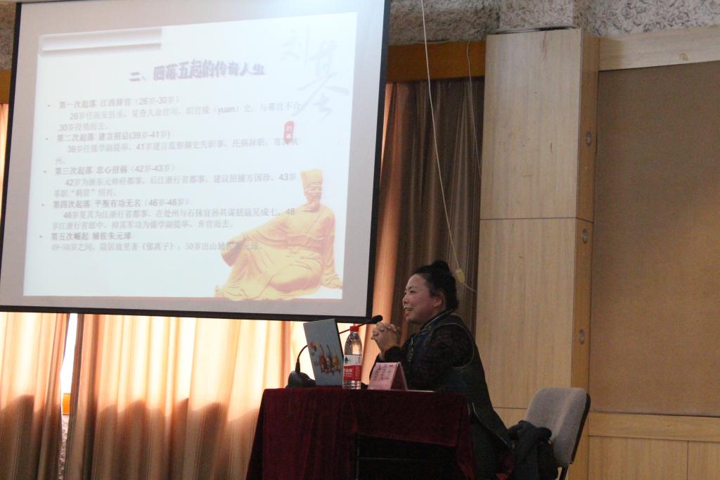 俞教授首先从刘伯温的“五大传奇”描绘了刘伯温的非凡人生及卓越功绩;其次围绕“刘伯温智慧之根——诚”出发,阐述了“性无不诚,然后能主一心,心无不明,然后能应万事。”的至诚真理,并结合《中庸》体悟“唯天下至诚,为能尽其性;能尽其性,则能尽人之性;能尽人之性,则能尽物之性;能尽物之性,则可以赞天地之化育;可以赞天地之化育,则可以与天地叁矣。”的人生哲学智慧;最后希望同学们结合新时代大学生的成长动力,从内而外,践行核心价值观诚信之道。