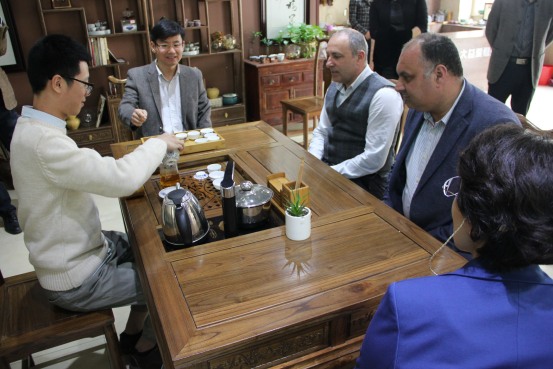 随后,马耳他旅游学院一行参观管理分院茶艺实训室和学院书法实训室。在茶艺实训室,我院学生为客人们表演了中国茶道。Pierre Fenech院长对学生茶道表演赞不绝口。Noel Buttigieg博士对中国文化非常向往,尤其对中国书法非常痴迷。在参观院书法实训室时,何铁山教授向客人们讲解了中国书法的博大精深,并赠送了一幅他的书法作品给Noel Buttigieg博士。