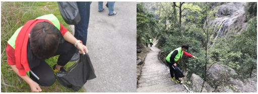活动当天下午,环保专业学生、环保企业员工等六十多名志愿者集合永嘉绿色动力再生能源有限公司大门口浩浩荡荡地出发,有提垃圾袋的,有拿钳子的,从永嘉三江街道梅园村岭脚至胜美尖顶,一路捡拾垃圾。这里山泉甘美,草木丰茂,奇花异草随处可见,生态绝佳。胜美尖不仅有陡壁奇峰,还有山涧的潺潺流水。志愿者们热情高涨,直叹风景优美的同时更增添了一份保护环境、保护生态的责任心。志愿者们以身示范的行为带动了更多的行人不随手乱丢垃圾,积极为守护绿水青山献出自己的一份力。