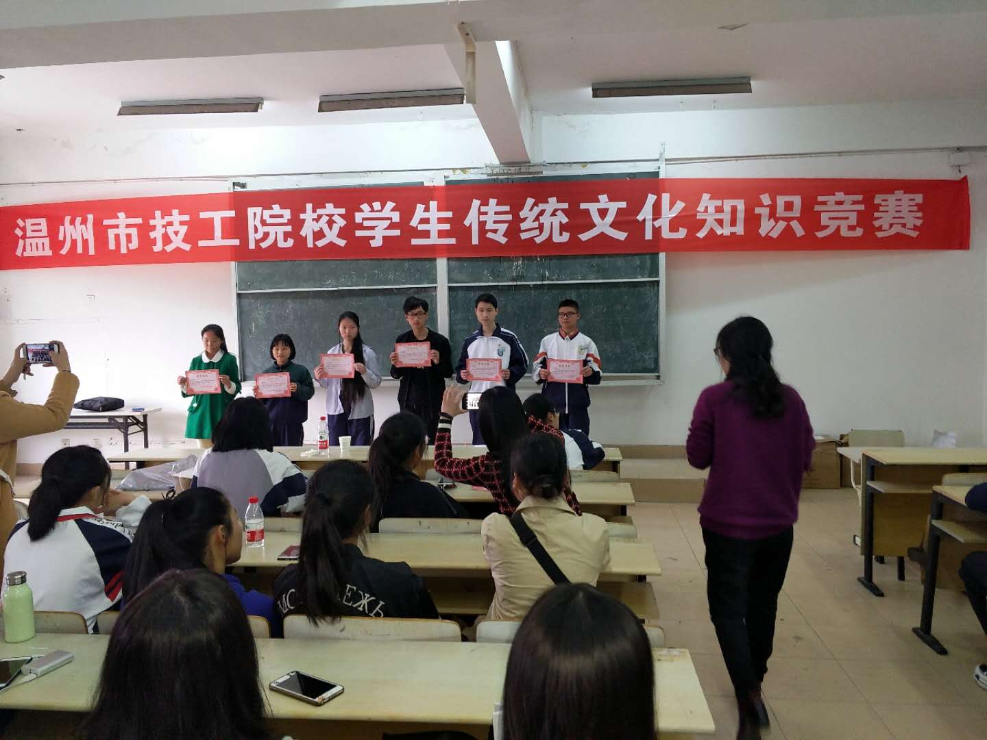 4月16日,2018年温州市技工院校学生传统文化知识竞赛在温州技师学院举行,本次竞赛全省共有7所技工院校56名选手通过前期层层选拔参加了此次角逐。我院共有8名学生参赛,学生稳定发挥,最终我院学生陈洁茹、陈慧慧、项依雯三人获三等奖;孙幸子荣获二等奖。