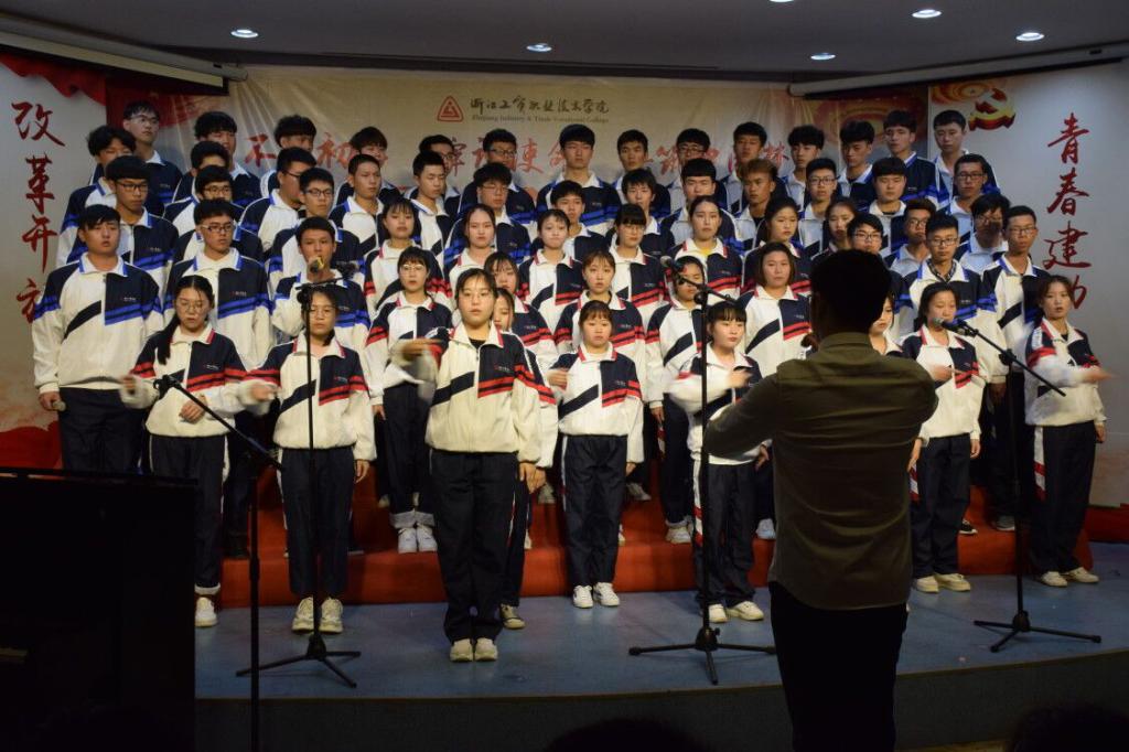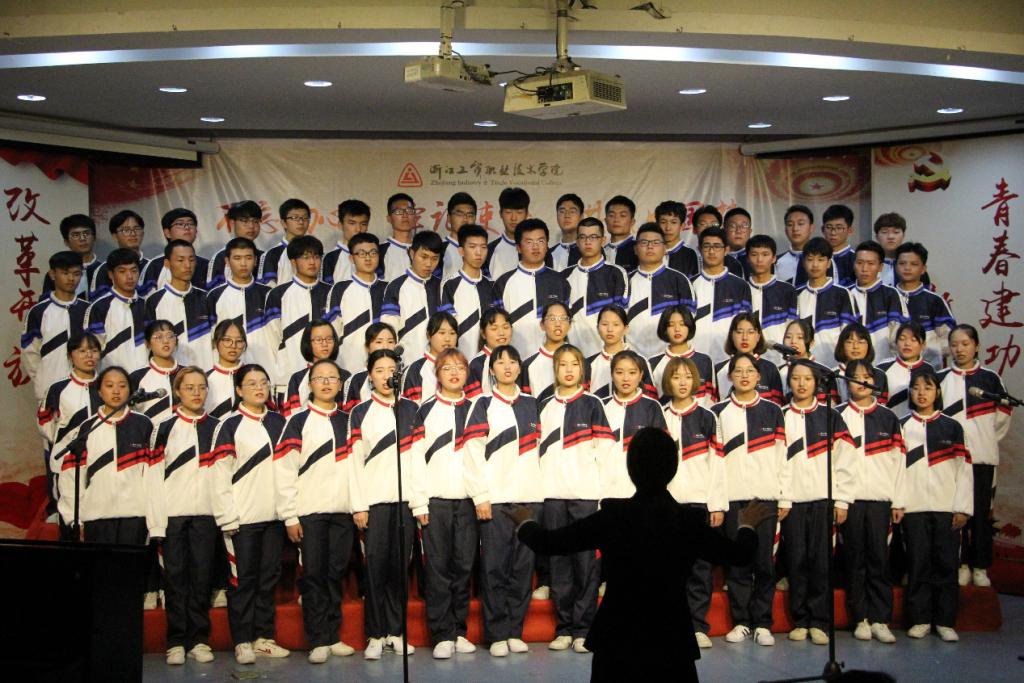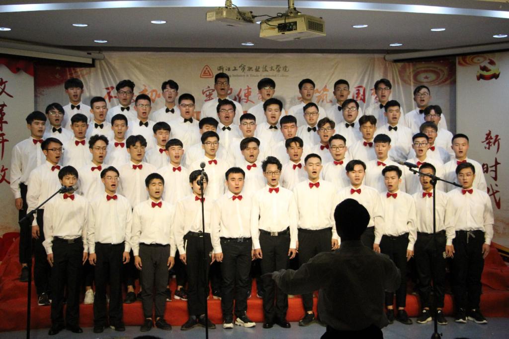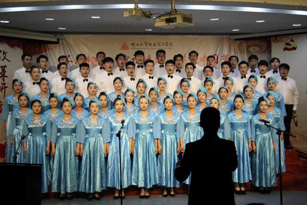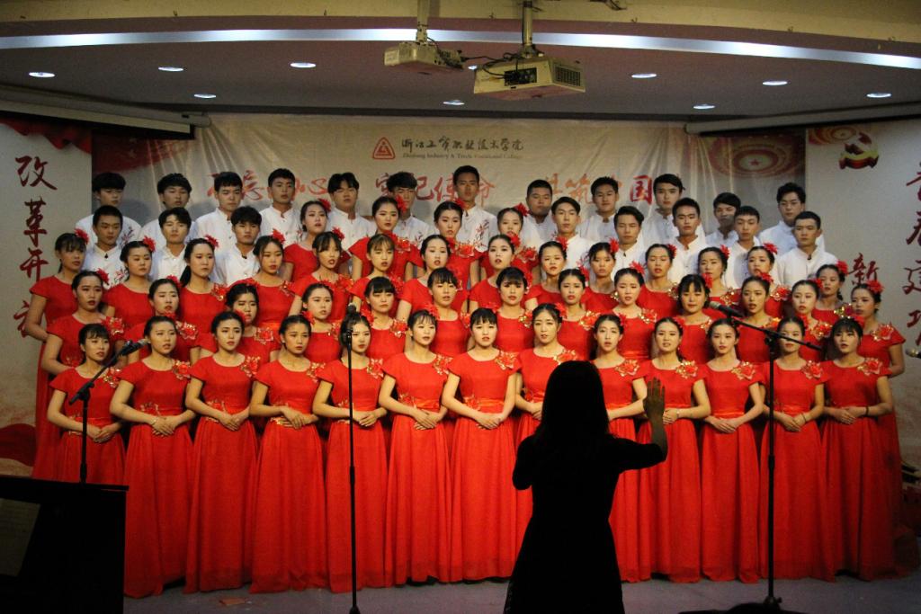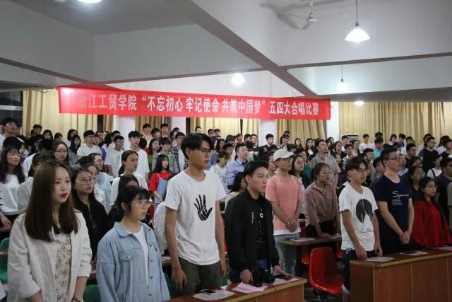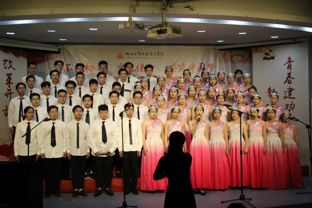 “起来,不愿做奴隶的人们。。。。。。”国歌声肃然响起,激昂的声音在我们耳畔环绕,激起内心阵阵波澜。本次大合唱比赛每支队伍两首演唱曲目,比赛顺序赛前抽签决定,首先上场的是电子系的同学们,他们以一首熟悉的《龙的传人》拉开了比赛的序幕。紧接着一首《时间都去哪儿了》让比赛现场暖意融融。《鸿雁》、《我爱你,中国》、《中国,中国,鲜红的太阳永不落》、《在灿烂阳光下》、《国家》、《唱支山歌给党听》、《追寻》、《走向复兴》等一首首脍炙人口的歌曲,表达出了参赛选手们对伟大祖国的热爱,唱出了我们青春的梦想,也感染了在座的每一位同学。一首首红色经典唱出了工贸学子的激情,唱出了工贸学子的豪迈,唱出了工贸学子的风采。伴随着设计分院演绎的《不忘初心》和《青春舞曲》,此次大合唱也在催人奋进的氛围中走向尾声。