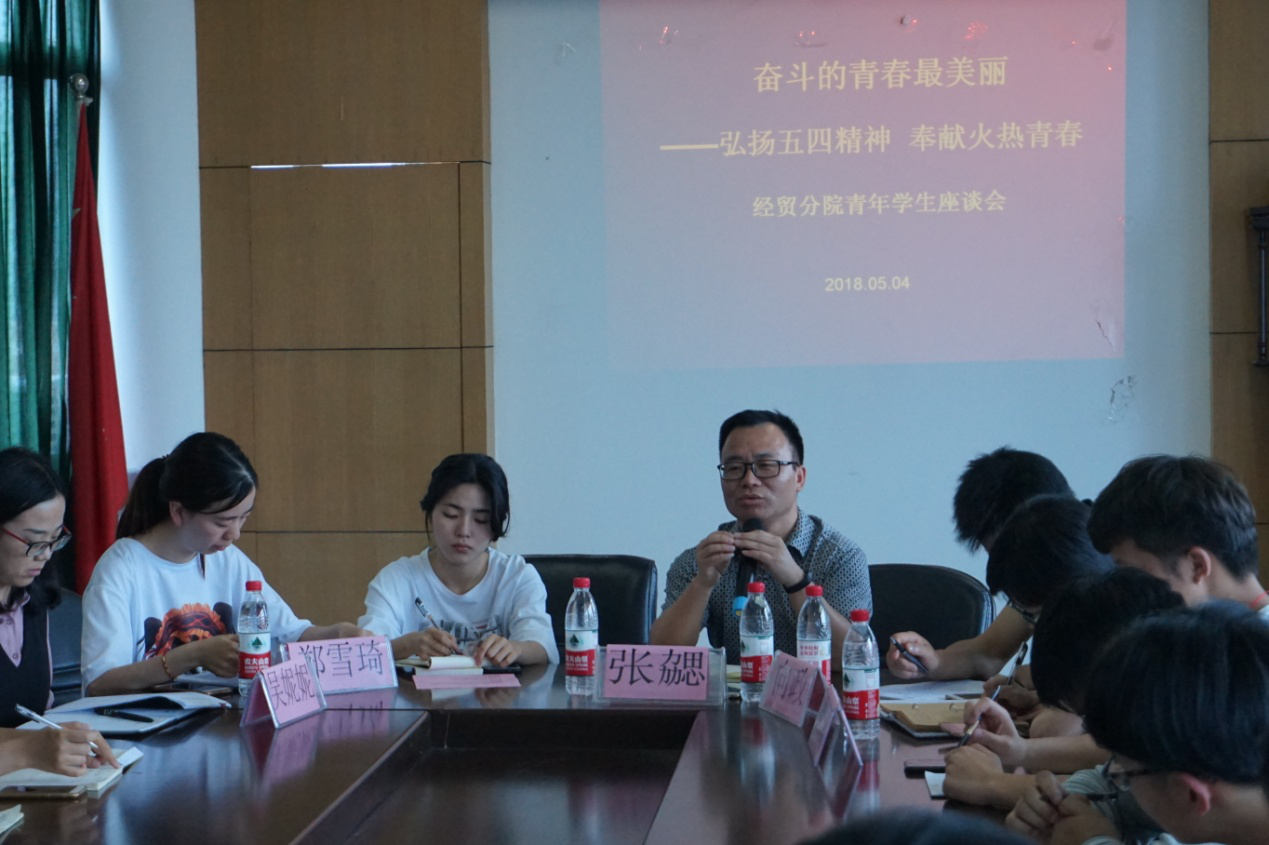 为纪念五四运动99周年,传播五四精神,经贸分院青年学生座谈会于2018年5月4日在六楼会议室成功举办。参加本次座谈会的有:经贸党总支书记张勰,辅导员向政、周妍妍、郑雪琦、吴妮妮,以及分院40位学生代表。