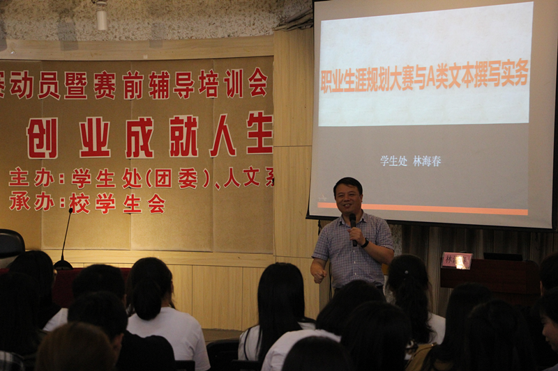 为进一步强化大学生的职业规划意识和创新创业意识,提高大学生就业创业意识和能力。5月3日,第十届职业生涯规划大赛动员暨赛前辅导培训会在多功能厅举行。学生处处长林海春为在座同学做职业生涯规划大赛专题培训。