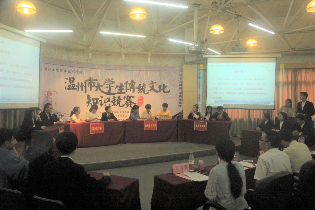 经过各高校校内选拔推荐,共有8所高校代表队进入决赛。决赛分为五轮,分别是抛头露面、粉墨登场(团队展示);斗志昂扬、蓄势待发(必答题);九转功成、积沙成塔(抢答题);环环相扣、一触即发(轮答题);安之若素、剑走偏锋(挑战题)。团队展示环节,8支代表队紧紧围绕传统文化的主题,分别开展了歌舞、器乐、演讲、朗诵、器乐表演等风采展示。温州医科大学的相声《古韵杂谈》,以普通话、温州话相串,展现温州多元的区域文化,亦庄亦谐;浙江东方职业技术学院朗诵《我骄傲,我是中国人》,以激昂澎湃的气势展现了作为炎黄子孙的骄傲自豪。现场竞答环节,选材涉猎广泛的题目不仅给选手们带来挑战,也给现场观众以传统文化的耳濡目染,选手们尽显团队智慧,或必答题的胸有成竹,或抢答题的争先恐后,或轮答题的意犹未尽,或挑战题的攻城略地,表现十分出色,展现了扎实的传统文化知识功底及昂扬向上的精神风貌,赢得了现场评委及观众的阵阵掌声。