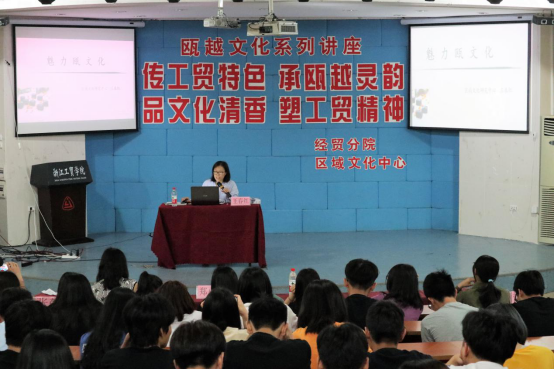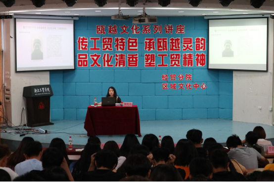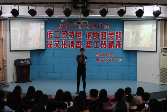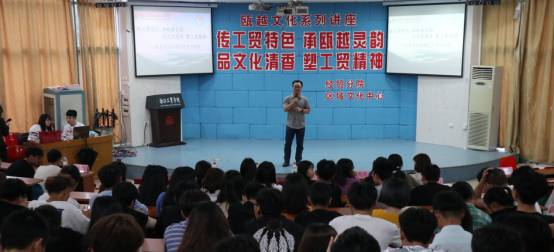 为推进校园文化建设,引导学生重视并传承瓯越文化,5月23日,经贸分院在阶梯教室成功举办了以“传工贸特色 承瓯越灵韵 品文化清香 塑工贸精神”为主题的瓯越文化系列讲座。出席此次讲座的主讲嘉宾有区域文化研究中心郑央凡大师和王春红博士,经贸分院党总支书记张勰,辅导员吴妮妮以及经贸分院学生300余人参加了本次活动。
