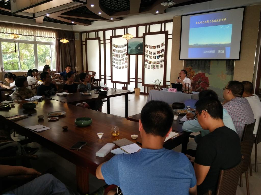 6月8日下午,第七场“聚贤论道”沙龙系列活动在我院大益茶室举行。现场邀请市社科联主席潘忠强,以“新时代咨政课题的选题与写作”为题,与我院社科类教师作交流、研讨。来自各二级院(系)及部门30余位教师,参加了此次沙龙活动。