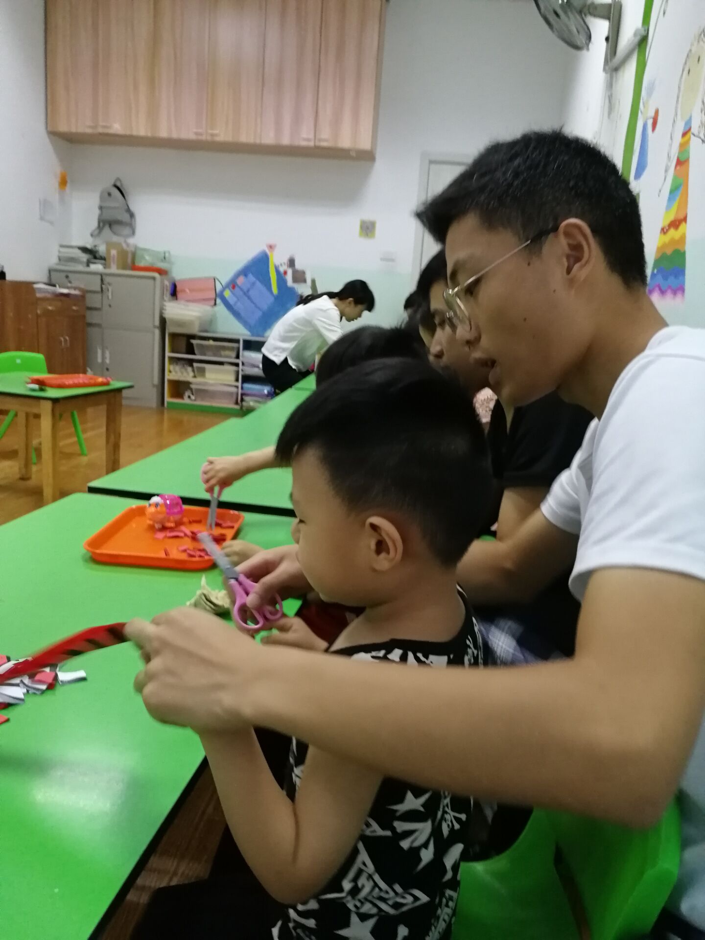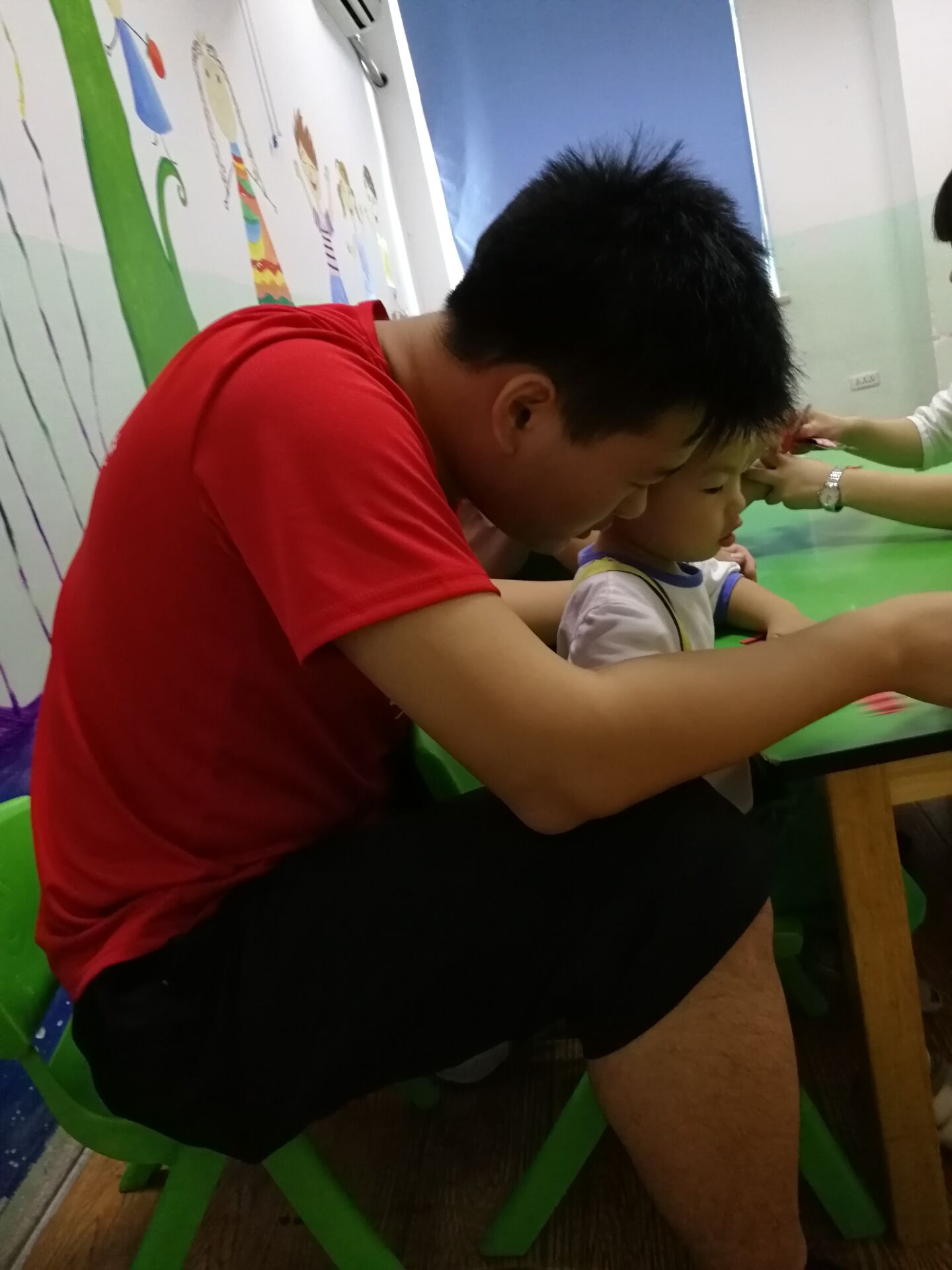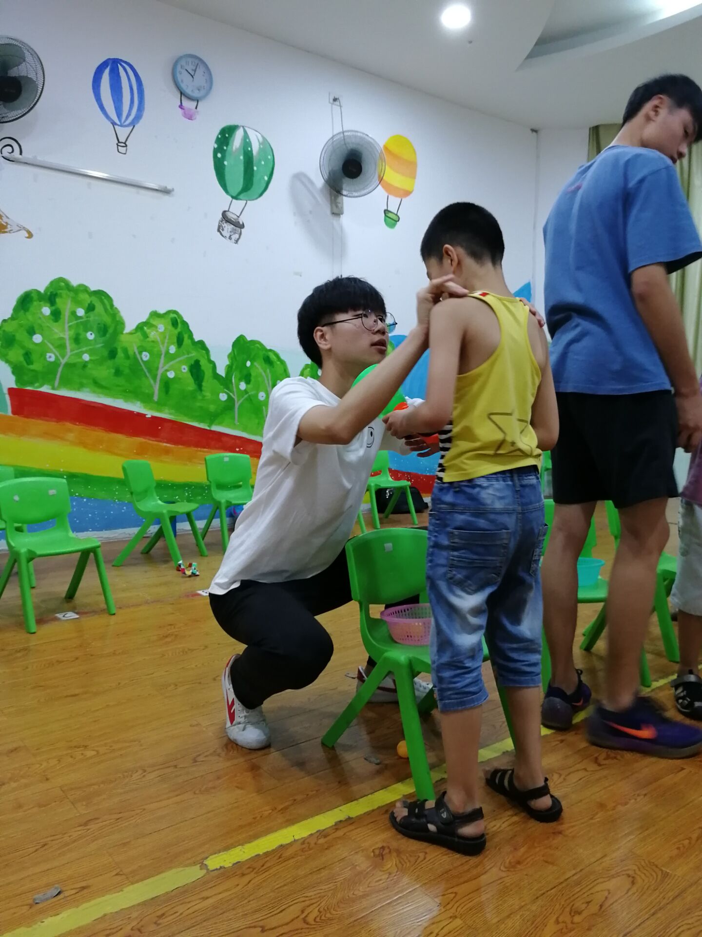 2018年7月5日,汽机分院“蓝丝带,传递爱”关爱自闭症暑期社会实践队前往星乐儿童成长中心照顾这些来自星星的孩子。在与星乐儿童成长中心的负责人进行对接之后,队员与孩子们进行了一对一的结对。我们的队员代替家长们陪伴孩子们上课。既让家长有休息的时间,又让我们与孩子之间的关系变得更加亲近。孩子们一天总共有六节课。队员在课堂上辅助老师,教孩子们做一些动作,培养他们自己思考,自己动手的能力。在中午,大家开了一个简单的会议,各自谈了一下自己的带娃感受。还有一名队员在办公室帮助老师整理资料,打印文件。在傍晚结束之际,指导老师陈旖旎老师在会议室给大家开了一个总结会议,队员们各自把一天的感受和经验总结汇报给老师,老师也相应地给出了一些建议。大家在拍完合照帮助中心老师整理东西之后结束了第一天的实践活动。