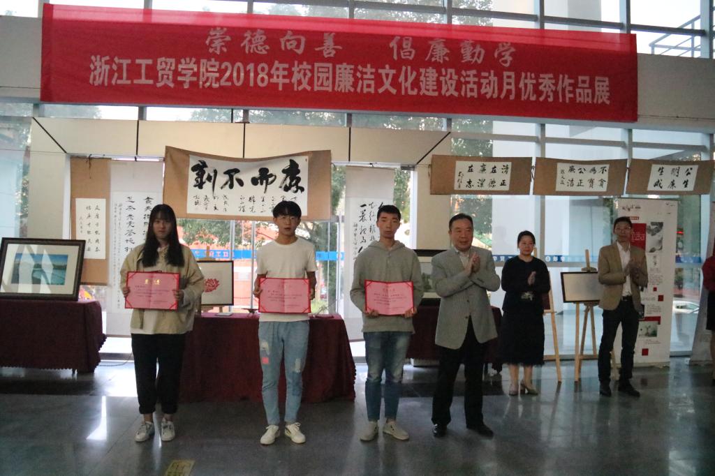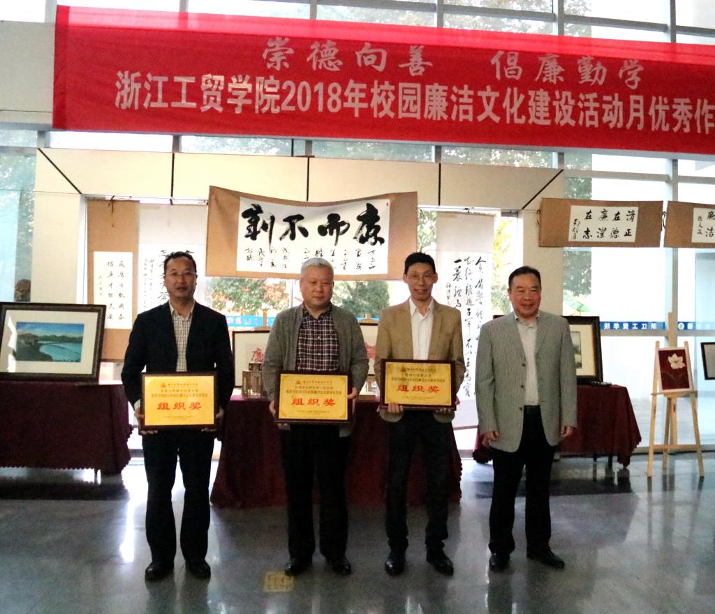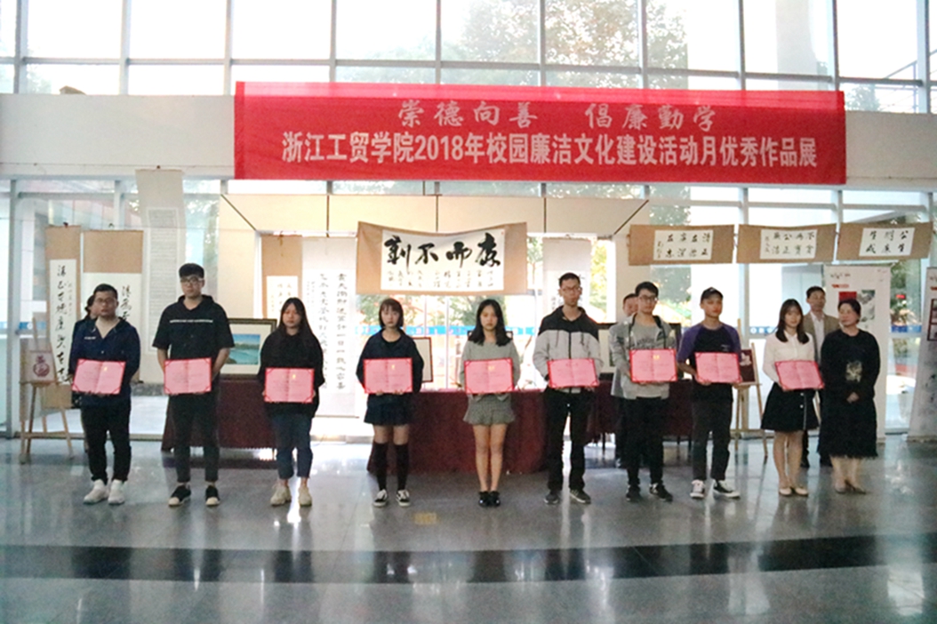 2018年,为了根植“崇德向善·倡廉勤学”理念,促进风清气正的校园文化氛围,学院围绕新时代全面从严治党要求和“清廉浙江”、“清廉教育”的决策部署,结合学院“内涵建设年”中心工作,开展了廉洁文化建设月活动。10月25日,学院在六号楼一楼大厅举行了2018年校园廉洁文化建设月活动颁奖仪式。学院党委书记盖庆武,纪委书记黄专途、纪委委员黄路瓯、项光春等出席并为获奖人员颁奖。