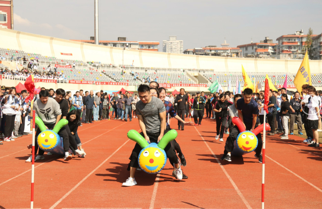 天公作美,昨天还是阴雨绵绵,今天却艳阳高照,仿佛为大家的运动热情所感染。第一个项目是迎面接力,盖书记手持发令枪,随着一声枪响,老师们一个个如离弦之箭,飞奔在跑道上,比速度,比配合,也比精神。有的老师因速度过快,不慎摔倒,但并未放弃,迅速爬起,全力赶拼,将接力棒交到队友手中,体现了顽强拼搏、团结协作的精神。经过一番角逐,行政一一马当先,夺得第一,材料系、经贸分院名列第二、第三。奋勇争先项目开始了,各队派出四名队员,骑在蓝色的巨型毛毛虫身上,迈着整齐的步伐,奋力前进。最后人文系拔得头筹,设计分院、汽机分院名列第二、第三。齐心协力重在队员之间的配合,有些队伍配合默契,喊着口号,步伐一致,顺利到达终点,有的队伍则稍有不慎,摔得人仰马翻,只得重整旗鼓,继续前进。成教学院在此项目中夺得第一,行政二、电子系名列第二、第三。