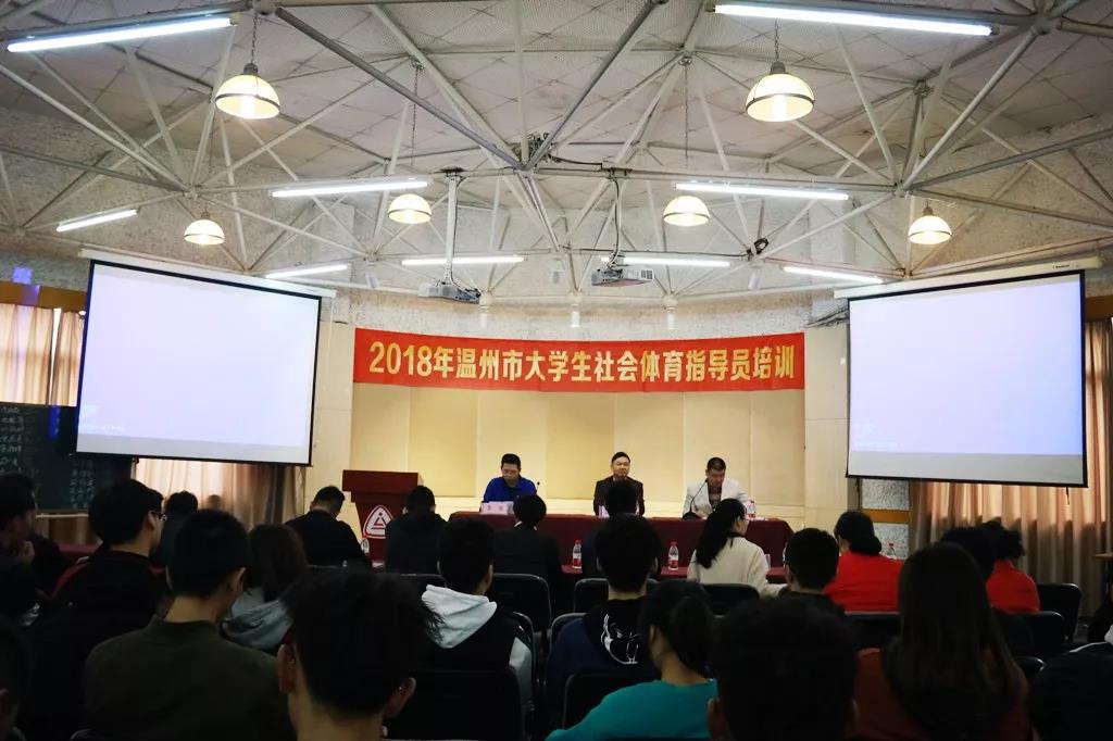 11月19至20日,2018年温州市大学生社会体育指导员培训班在我院举行。共有87名大学生参加了培训。培训班开课前举行了开班仪式,温州市体育局群体处处长温从达、伟德BETVlCTOR1946网球学院副书记朱景多、伟德BETVlCTOR1946网球学院体管专业主任朱秀清、体育教研室主任白福川、指导老师邹文平、辅导员谢戴海等出席了开班仪式,温州市社会体育指导中心社体科副科长李勇主持开班仪式。