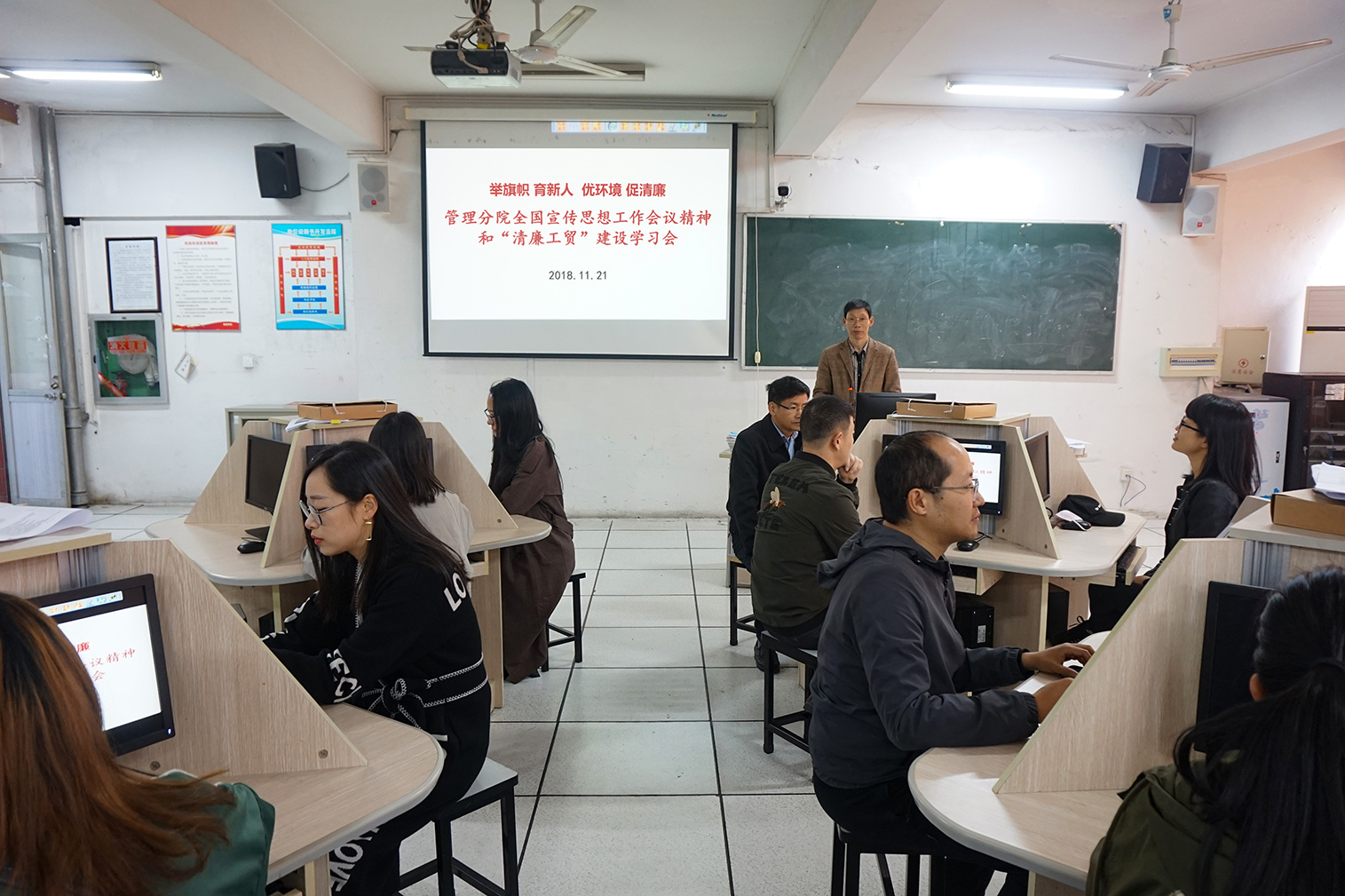 为了学习贯彻全国宣传思想工作会议精神和学院“清廉工贸”建设实施方案,加强和改进分院教职工政治理论学习工作,提高分院教职工政治思想理论水平和思想道德素质,提升思想政治教育能力,管理分院于2018年11月21日下午在3601教室举行教职工政治理论学习会,管理分院全体教职工参加,会议由管理分院党总支书记项光春老师主持并宣讲。