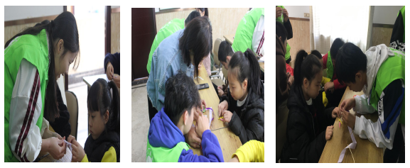 知识课堂上,以“安全”为中心,以“防拐”为主题展开。志愿者先以一个问题“如果遇到陌生人,该怎么办?”开始课堂。学生们积极回答:“快逃掉”、“不理他,继续自己玩”…志愿者们给大家介绍了正确的处理方法,并和学生讨论了什么是坏人?坏人的定义是什么。接着,志愿者告诉小朋友遇到陌生人或者坏人时,应该做什么以及在走丢的时候应该怎么办等安全知识。课堂的最后,志愿者与学生们一起观看《如何防拐》视频,让学生们通过生动的动画更好地掌握防骗知识技能。听完了讲座,志愿者带领学生们一起制作发卡,学生们认真地制作发卡。在志愿者的帮助与学生们的努力下,做出了不一样的手工发卡。