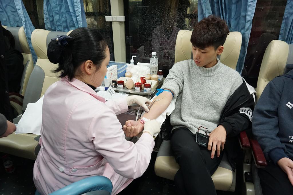 在献血活动还没有正式开始时,已有一些热情踊跃的同学们就已经填好献血表格等待着献血前的体检。同学们的热情极高,填表处、量血压处、验血处络绎不绝。虽然排队献血的队伍很长,等待的时间也较长,但丝毫抵挡不了同学们的热情。还有我们在各个岗位上勤劳的志愿者们,他们为献血者登记、指引、打印献血证、发放礼品以及在献血车上服务前来献血的同学们。虽然志愿者的任务比较辛苦但他们不喊苦不喊累,为自己能服务他人而感到快乐。