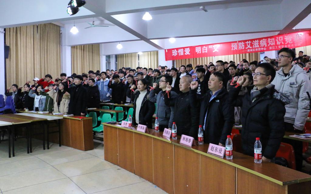 经过激烈的比拼,最终经贸分院获得一等奖;信息分院、管理分院荣获二等奖;电子系、成教学院、技师学院获得三等奖。在活动的最后我们安排了丝带宣誓环节,全场300多人系上红丝带,庄严的举起右手郑重宣誓志愿成为抗击艾滋病的一员,主动了解艾滋病的相关信息,保护自己,与朋友、家人分享知识和经验,积极向社会宣传艾滋病防治知识,关爱和支持受艾滋病影响的同伴和家庭,与伙伴们携起手来,共同承担社会责任,共同抗击艾滋病。