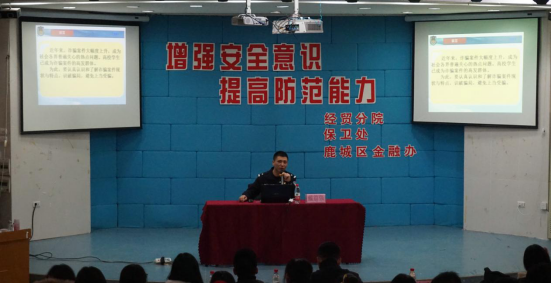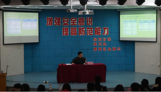 为进一步提高大一新生的安全防范意识及对各类诈骗的识别能力,2018年12月13日经贸分院在阶梯教室举办了以“增强安全意识,提高防范能力”为主题的安全知识讲座。本次讲座由温州市公安局基层基础大队大队长戴益强,鹿城区金融办监管科余藤藤老师主讲。出席本次活动的有鹿城区公安分局经济犯罪侦查大队林上钧警官,经贸分院党总支书记张勰,辅导员吴妮妮,另有300余名经贸学子参加了本次讲座。