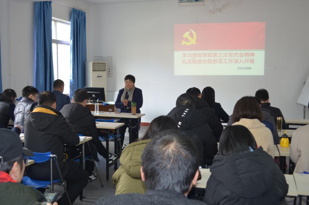 会上,杨松涛书记首先作《学习贯彻学院第三次党代会精神,扎实推进分院各项工作深入发展》主题报告。杨书记带领大学学习学院党代会精神要点,一是党代会的主题及奋斗目标是建设中国特色高水平高职院,是我们全体教职工要奋斗的目标。此次党代会为学院发展描绘了宏伟蓝图,为打造“百年工贸”指明了道路。二是学院党代会提出了今后五年学院工作的总体要求和今后改革发展的主要任务,统筹推进品质工贸、活力工贸、智慧工贸、和谐工贸、美丽工贸、清廉工贸建设,同时提出围绕“六个工贸”建设的具体要求,把握改革发展的主要任务,抓住关键环节,坚持精准施策,创新工作。三是提出人才强校、质量强校、创新强校战略。四是做好从严治党各项工作,要求党员干部、普通党员、普通教师都要以身作则,以身示范,做一个遵纪守法的好教师。最后,书记围绕系部党建工作、学生思政、招生就业、毕业生跟踪调查等工作重点做了安排和部署,要求大家加强政治理论学习,持续学习学院党代会精神,并认真落实在本职工作中。