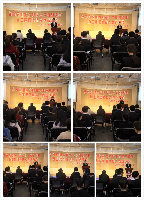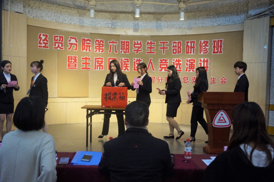 2019年3月28日晚18:00,经贸分院团总支学生会于多功能厅成功举办了经贸分院第六期学生干部研修班暨助理团候选人竞选大会。经贸分院党总支书记张勰,辅导员向政、郑雪琦、周妍妍、吴妮妮,学生会主席朱凯、团总支副书记钱余敏、17级团总支副书记丁凯丽,经贸分院团总支学生会代表以及班级学生、团员代表参与了此次活动。