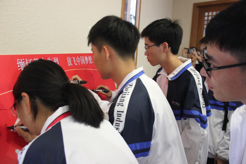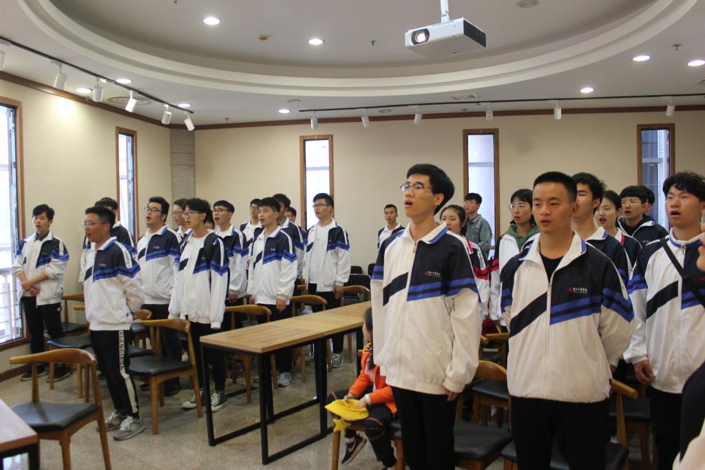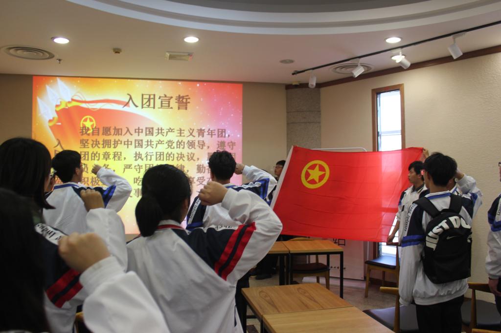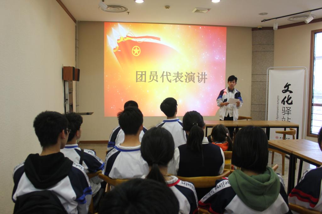 下午三点,成员们在校门口集合,并在黄老师和团务部带领下步行到达活动地点——温州市博物馆。首先,各成员来到博物馆二楼的文化驿站,由黄老师致活动开幕词后,全体起立齐唱国歌。在国歌结束后,团员代表牛添龙上台做团旗下演讲。牛添龙同学的演讲中说到五四精神是要忧国忧民、热爱祖国、积极创新、探索科学,是要发扬中华民族的传统美德,是要做一个德、智、体、美、劳”全面发展并成为一个对祖国、对人民有益的新时代青年。而后,由黄老师为三名团员代表佩戴团徽,并在黄老师的带领下,全体成员在团旗下重温入团誓词并齐唱团歌。