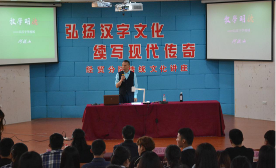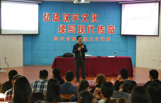 2019年4月17日下午3:30,经贸分院在阶梯教室举办了以“弘扬汉字文化,续写现代传奇”为主题的传统文化讲座。本次讲座由人文系艺术教研室主任、书法篆刻研究所所长、中南大学国学研究中心兼职教授何铁山教授主讲,出席本次讲座的有经贸分院党总支书记张勰、辅导员吴妮妮、上一届团副丁凯丽,以及经贸分院学子340余人。