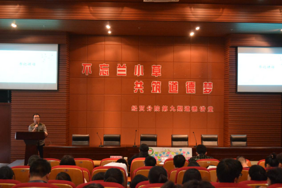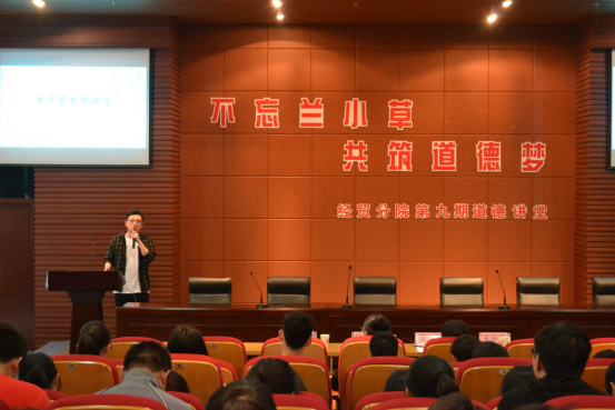 “左手做的好事,右手也不必知道”。朴素却又不平凡的一句话,当中满含了“兰小草”王珏对儿子王子震的谆谆教导。为了传播“兰小草”的善行,让善的种子播撒在同学们的心中,经贸分院于4月20日上午9:30在学术报告厅举办以“不忘兰小草,共筑道德梦”为主题的第九期道德讲堂。本次活动特邀“兰小草”王珏之子王子震,参与活动的还有经贸分院党总支书记张勰、辅导员吴妮妮、团总支副书记钱余敏,以及近三百名经贸学子。