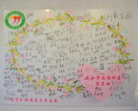 “在父亲追悼会的那一天,当地的百姓一大早自发地为他送行,来见他最后一面,送他最后一程。”子震说。他以“左手做的好事不要告诉右手”来总结了“兰小草”的精神:隐善、诚信、从小事做起,并向同学们提出了三点建议:要从平常的小事做起传递自己的爱心;乐观的面对生活,积极地面对每一天;充实自己的内心,获得精神上的财富。