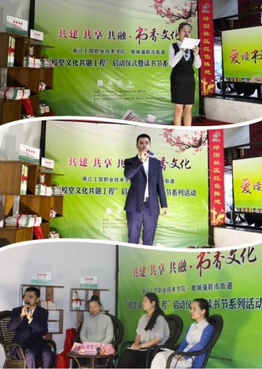 在“4·23世界读书日”来临之际,为倡导全民阅读,营造书香工贸,助推校园文化建设,服务师生及社会大众,推进学习型社会建设,学院与温州市蒲鞋市街道进行“文化结亲”,共建、共享、共融联合开展“校堂融合工程”。4月26日,在蒲鞋市街道绿园社区家风文化广场学院图书信息中心联合院团委与蒲鞋市街道绿园社区隆重举行“校堂融合工程”启动仪式暨读书节系列活动。