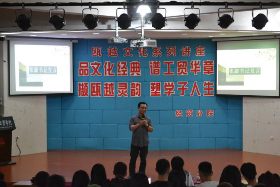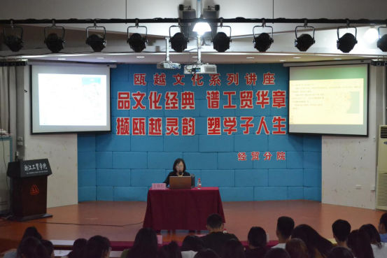 为推进校园文化建设,重视和传承瓯越文化,经贸分院于5月16日晚上18:30在阶梯教室举办了以“品文化经典,谱工贸华章,撷瓯越灵韵,塑学子人生”为主题的瓯越文化系列讲座第三讲。本次讲座由瓯塑研究中心郑央凡老师和区域文化研究中心王春红老师主讲, 参与本次讲座的有经贸分院党总支书记张勰,团总支书记吴妮妮及300余名经贸学子。本次讲座由虞翔惠同学主持。